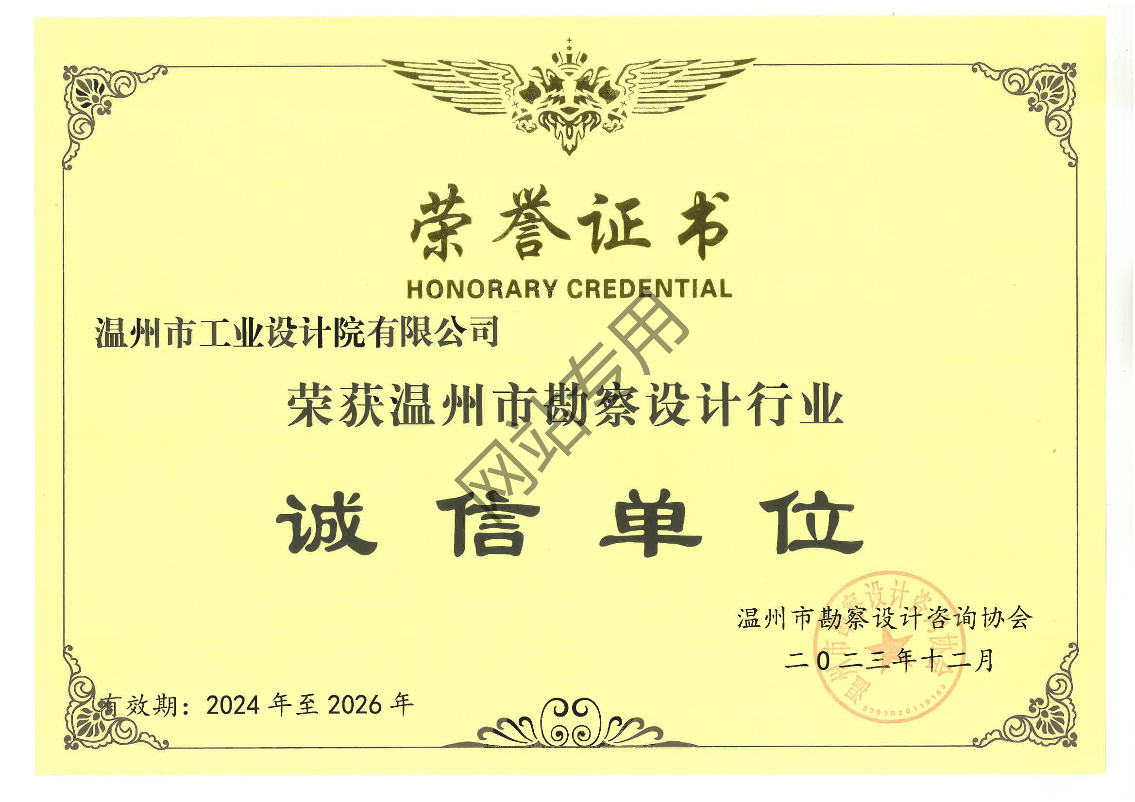 溫州市勘察設計行業(yè)誠信單位證書2024-2026